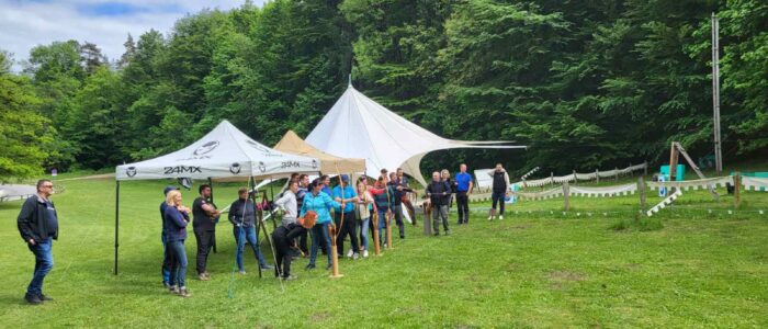 Nasmejani učitelji so nas na Bledu ob jezeru že pričakali, da nam pokažejo kako obvladati lok. Ob začetnem sprejemu so nas kaj hitro naučili, kaj je dominantno oko, pravilna drža loka in lokostrelca. Priredili smo tudi tekmovanje, po njem pa se preizkusili še v metanju sekire in streljanju loka na različne divje živali (seveda umetne).
